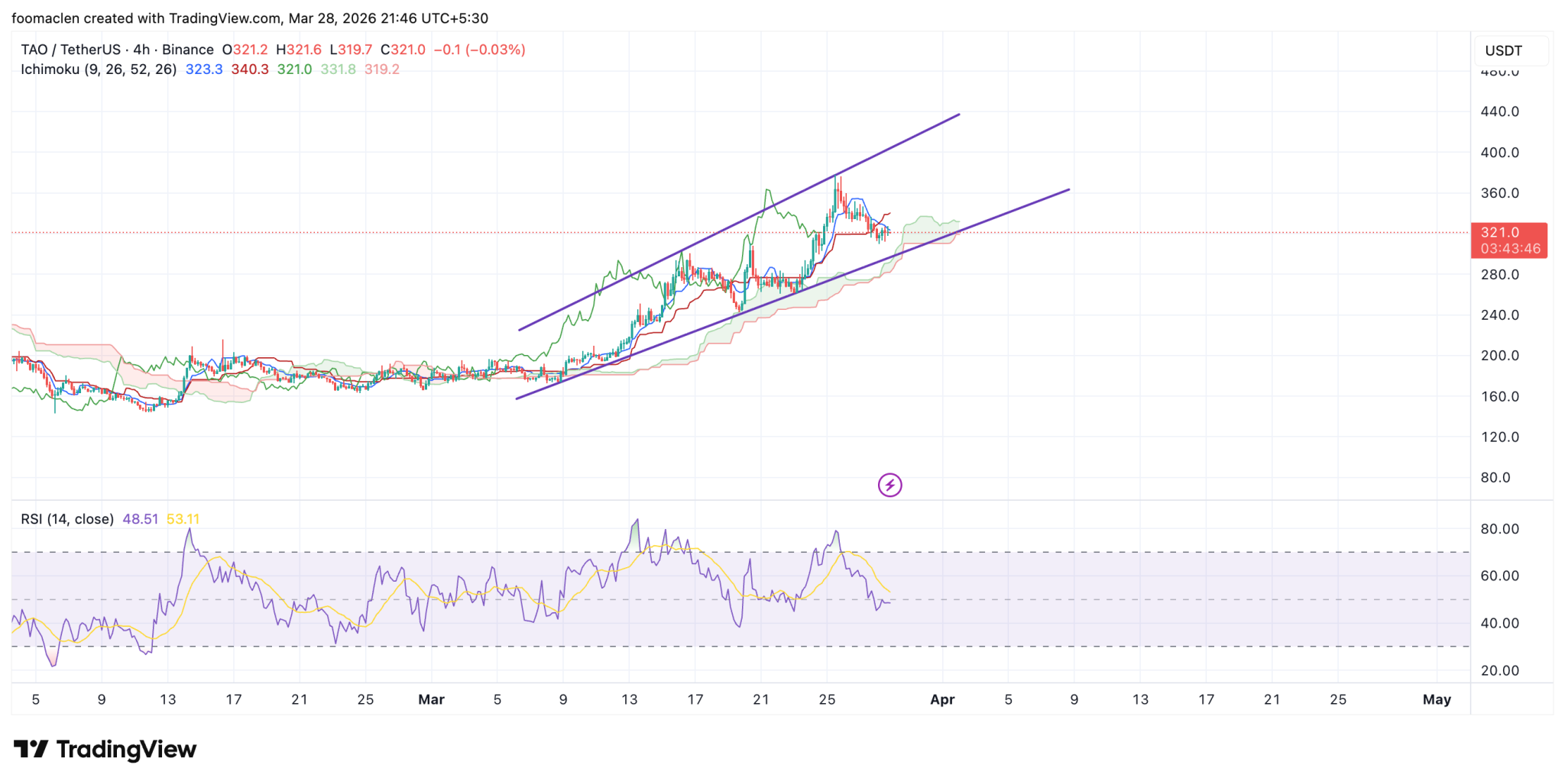 ] is among the star performers, with a monthly growth of nearly 80%, reaching from a low of $171 to 375.Currently trading at $320.62 with -2.29% growth, TAO/USDT in a 4-hour frame shows firm bullish growth. RSI at 48 is neutral buying pressure, but the altcoin price is trading above the Ichimoku cloud, showing a buyer’s confidence.
