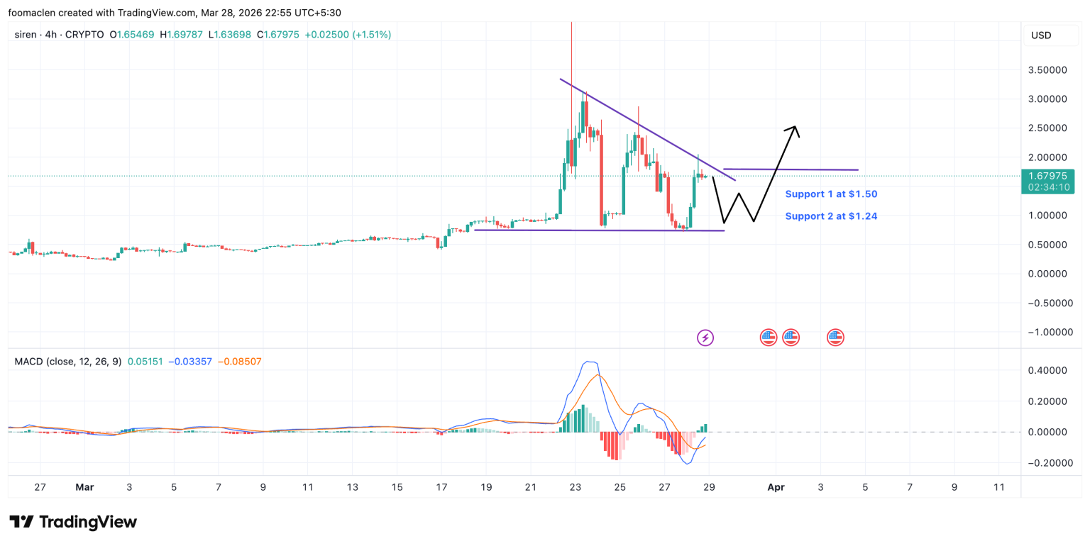 CRYPTO:SIRENUSD Target: $4 " class="wp-image-555031" style="width:668px;height:auto" srcset="https://image.coinpedia.org/wp-content/uploads/2026/03/29001422/SIRENUSD_2026-03-28_22-55-50-1024x514.png 1024w, https://image.coinpedia.org/wp-content/uploads/2026/03/29001422/SIRENUSD_2026-03-28_22-55-50-300x150.png 300w, https://image.coinpedia.org/wp-content/uploads/2026/03/29001422/SIRENUSD_2026-03-28_22-55-50-768x385.png 768w, https://image.coinpedia.org/wp-content/uploads/2026/03/29001422/SIRENUSD_2026-03-28_22-55-50-1536x770.png 1536w, https://image.coinpedia.org/wp-content/uploads/2026/03/29001422/SIRENUSD_2026-03-28_22-55-50-2048x1027.png 2048w" sizes="(max-width: 1024px) 100vw, 1024px" />In a bearish scenario, a break below $1.50, SIREN could retest the support at $1.20.