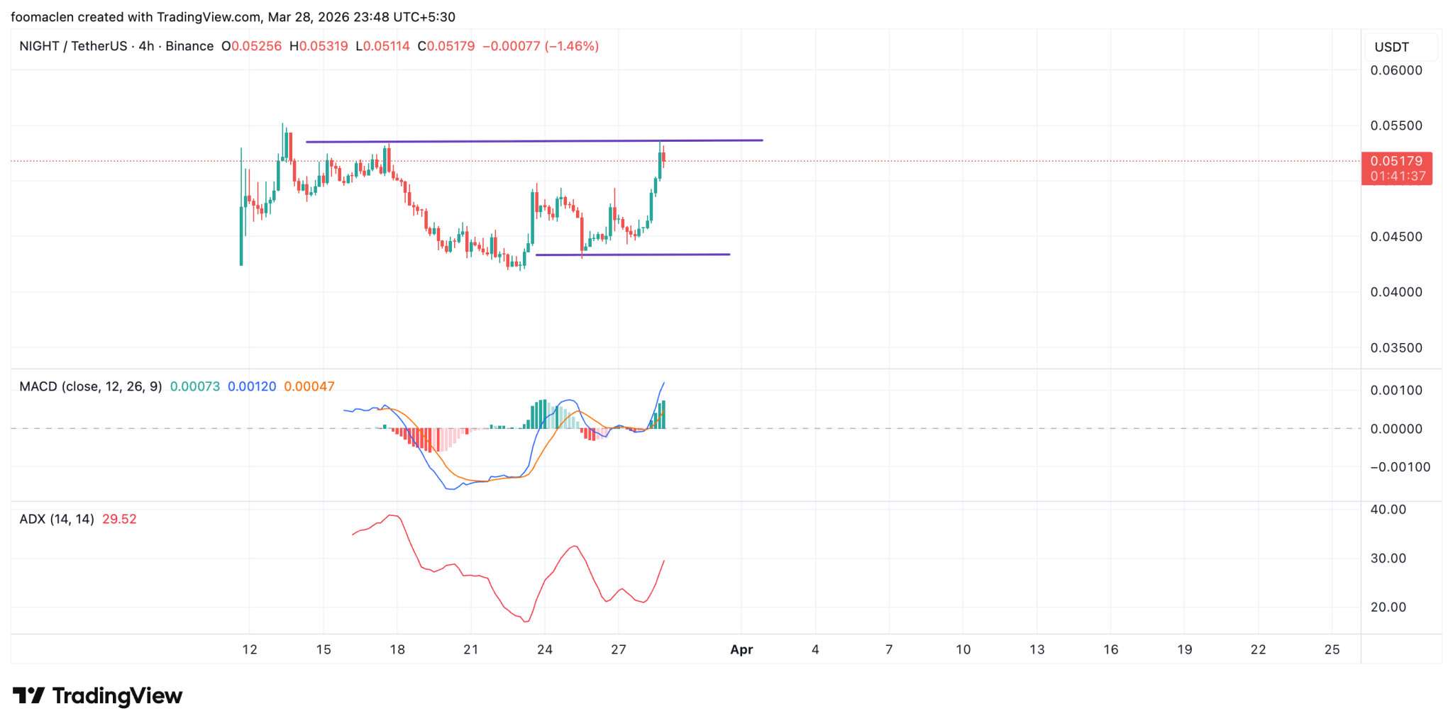 PYTH:NIGHTUSD Target : $0.072015 " class="wp-image-555032" style="width:693px;height:auto" srcset="https://image.coinpedia.org/wp-content/uploads/2026/03/29001452/NIGHTUSDT_2026-03-28_23-48-23-1024x514.png 1024w, https://image.coinpedia.org/wp-content/uploads/2026/03/29001452/NIGHTUSDT_2026-03-28_23-48-23-300x150.png 300w, https://image.coinpedia.org/wp-content/uploads/2026/03/29001452/NIGHTUSDT_2026-03-28_23-48-23-768x385.png 768w, https://image.coinpedia.org/wp-content/uploads/2026/03/29001452/NIGHTUSDT_2026-03-28_23-48-23-1536x770.png 1536w, https://image.coinpedia.org/wp-content/uploads/2026/03/29001452/NIGHTUSDT_2026-03-28_23-48-23-2048x1027.png 2048w" sizes="(max-width: 1024px) 100vw, 1024px" />The Support for NIGHT now sits at $0.045 and $0.0423, and a resistance pain point at $0.5517, breaking beyond will push the altcoin to the $0.07 zone.